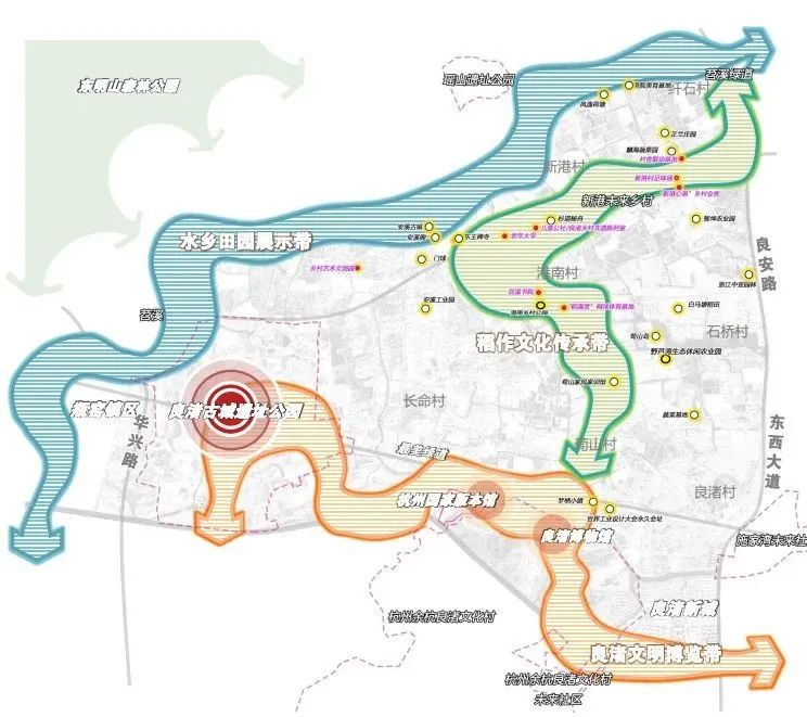 良渚-瓶窑“良渚遗韵”县域风貌区涉及良渚街道、瓶窑镇,范围北至苕溪,南至京岚线、西至华兴路、东至良安路,规划面积约3212公顷,重点建设良渚古城遗址公园、新港村、港南村等“七村一园”。