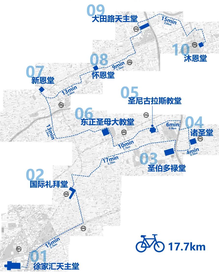 正逢骑行好时节,约上小伙伴,一起体验这条17公里的路线,亦可择选其中一段赴一场春日与历史之约,触摸时间流逝的痕迹,欣赏纯粹的建筑之美,感受繁华闹市中的庄严寂静,邂逅上海教堂建筑的“骑”迹之旅吧!