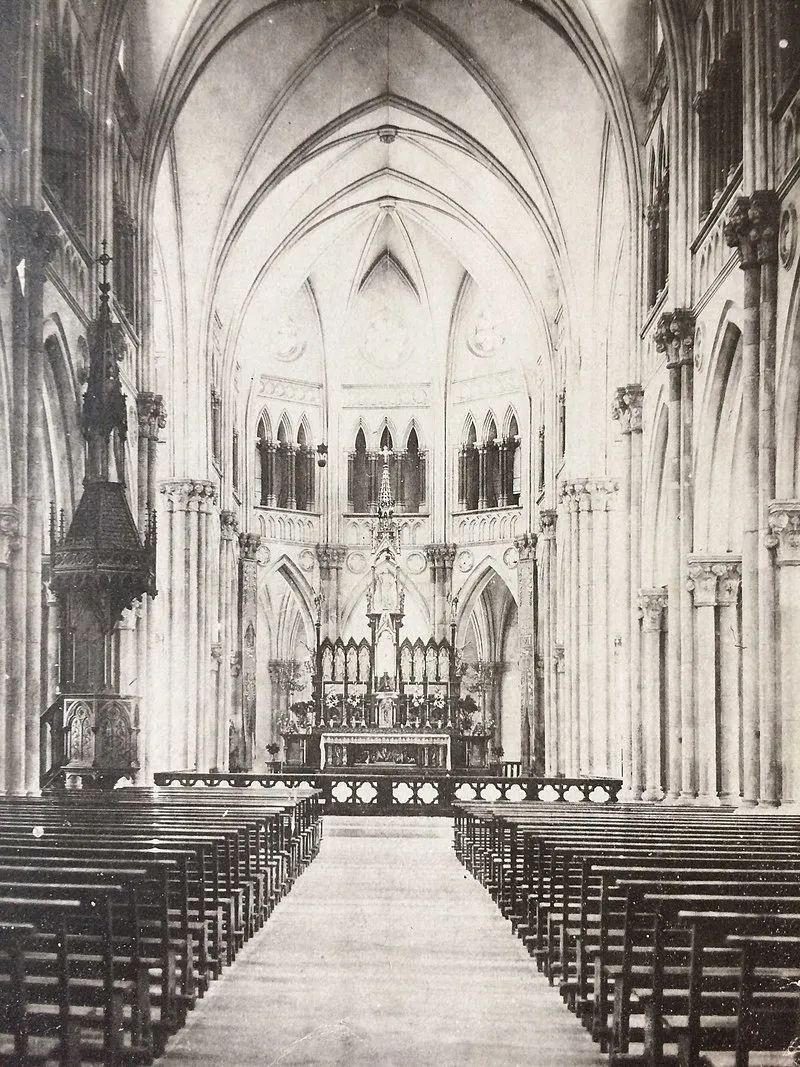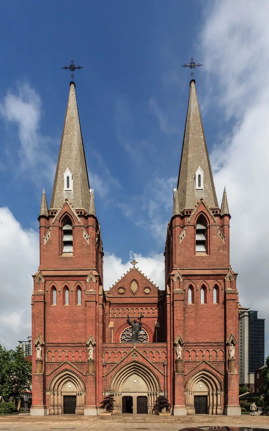 徐家汇天主教堂,建于1851年,新堂于1896年开始募款,1904年由道达洋行的英国建筑师道达尔(W.M.Dowdall)设计。1906年动工,1910年10月22日落成,为远东第一大教堂。教堂为中世纪哥特式,拉丁十字平面,砖木结构。1910年10月22日落成,为远东第一大教堂。