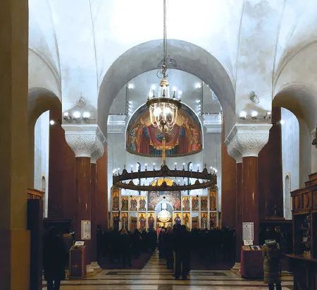 东正圣母大教堂,始建于1933年,历时3年建成这座宏伟的建筑。该建筑由建筑师兼画家利霍诺斯设计,为典型的俄罗斯拜占庭风格教堂,集中式布局,希腊十字平面,最中央高处为孔雀蓝色的大穹顶,高约35米,四角均有小穹顶,呈洋葱形状。