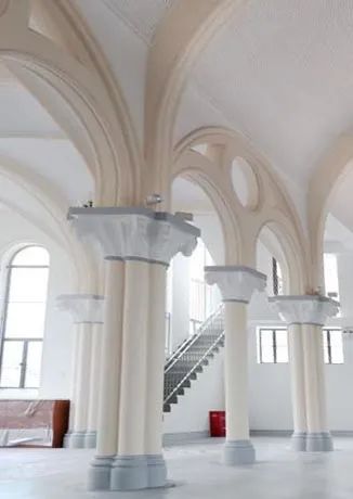 小德肋撒天主堂室内的柱子很特别,是束柱。”束柱顾名思义,是多根柱子合在一起,配合拱券,突出线条美,衬托了空间的高耸峻峭。