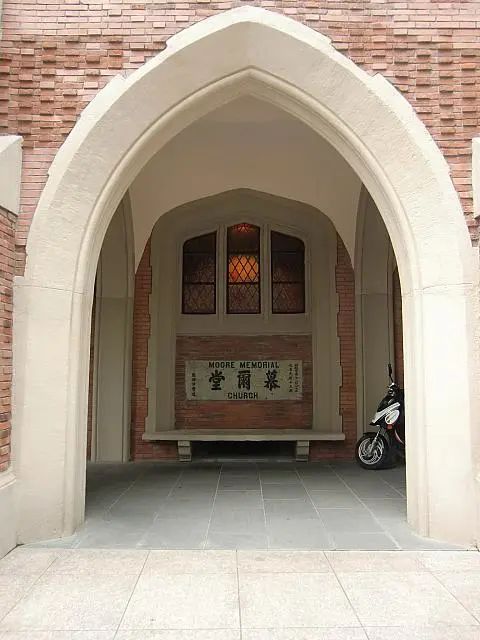 大门朝北,两边设尖拱长廊,窗框为弧拱形,镶嵌梅花纹玻璃。