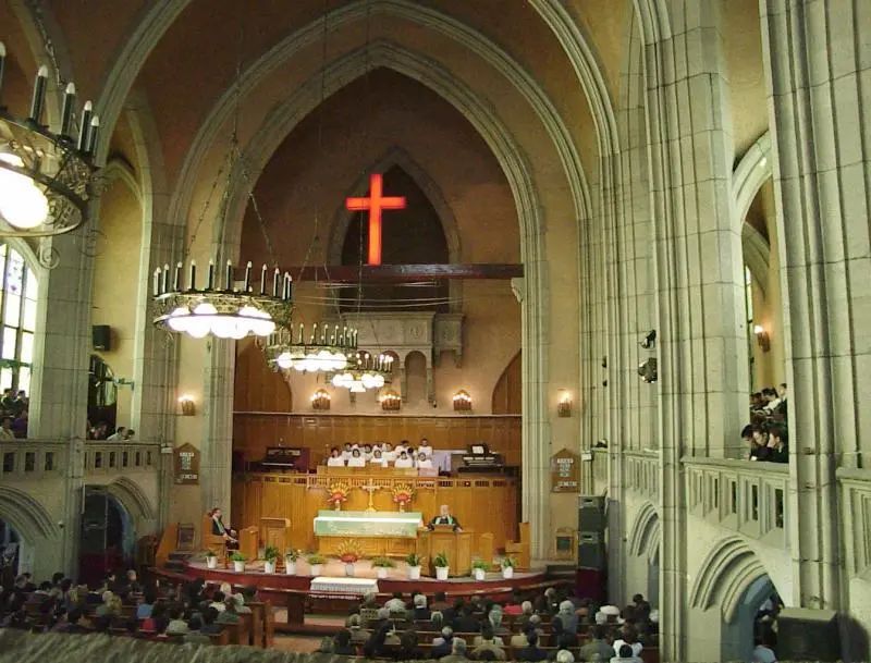 教堂顶部的5m高的旋转霓虹灯十字架是其最大特色。
