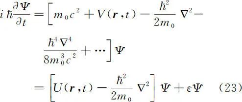 本文另辟蹊径,根据爱因斯坦的能量动量公式,级数展开后先建立一个精确的薛定谔方程(22),然后重新设置一个势能零点并定义一个新势能 U(r) = m0c2 + V(r),忽略极小项 ε,最终引出了常见的薛定谔方程(24)和方程(25)。笔者的引出过程简单而又严密。