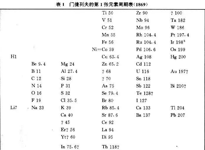 接着,他将当时已知的63种元素依相对原子质量大小并以表的形式排列,把有相似化学性质的元素放在同一列,制成元素周期表的雏形。