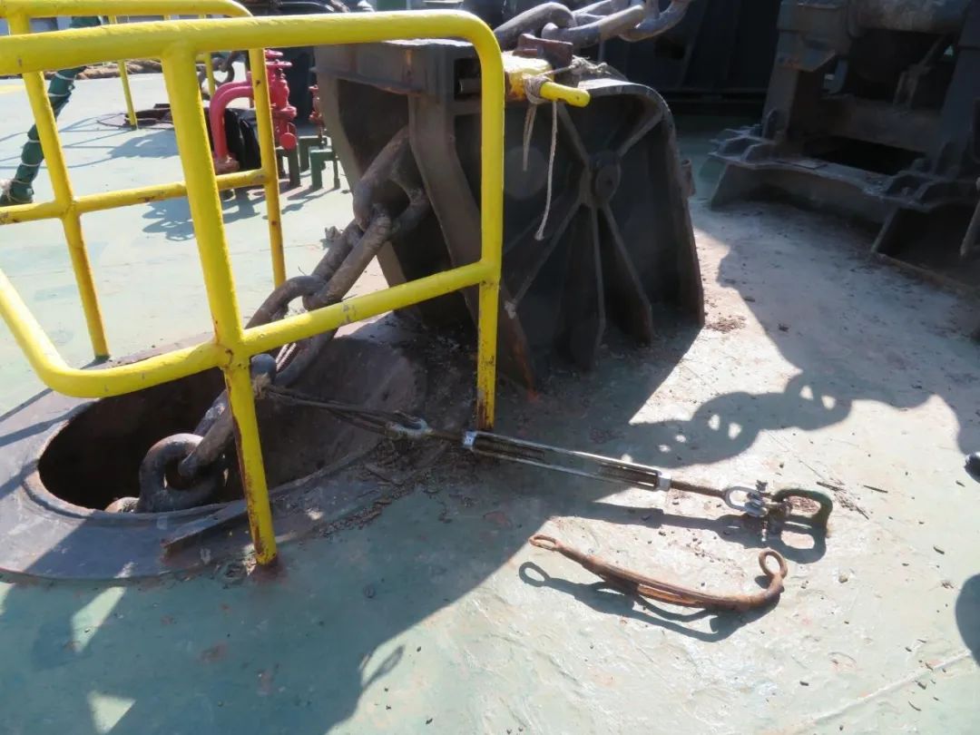 1.船舶应经常检查锚机刹车片、掣链器及安全销、加固钢丝等设备,及时更换或修复腐蚀受损部件,保证艏锚固定设备安全有效。开航前保证掣链器压紧销牢,系牢加固钢丝,防止航行过程中锚链滑脱。