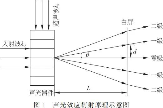 当超声波通过某一种晶体介质时,该介质分子的电偶极矩发生变化,进而使介质的折射率发生周期性变化形成超声光栅。当光束通过存在超声波的介质后会产生衍射现象,该现象称为声光效应。图 1 是声光效应产生的衍射现象原理示意图,平行单色光垂直于声场传播的方向,当声光晶体长度较短及超声波的频率较低时,产生喇曼奈斯衍射[3]。各级衍射角 θ 满足下列关系