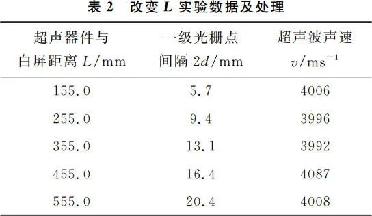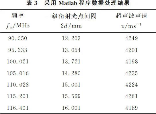 肉眼测距的方法容易受到人眼主观视觉误差的影响,因此选用计算机图像识别技术进行数据处理更受人们青睐。计算机通过 MATLAB 软件编写代码实现对图 3 的图像进行识别,使图片数据化,读取坐标纸上坐标长度和光强信息,然后选取光强极大值对应的长度信息进而计算出声速。在 MATLAB 程序中输入超声器件与光屏的距离 L、超声信号源的频率 fs 和 He-Ne 激光的波长 λ0 这些信息以及声速计算公式(3)式进行编程计算,得到一级衍射光栅点之间距离 2d 和超声波声速 v 的数值,数据如表 3 所示。