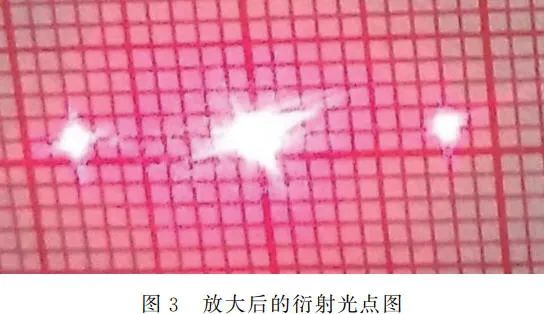本实验采用 LOSG-Ⅱ 型晶体声光效应实验仪(西安超凡光电设备有限公司)、He-Ne 激光器(波长为 632.8nm)、声光器件等仪器。声光器件是利用声光效应实现光信号处理的一类器件,其核心是声光晶体材料,本实验采用的压电晶体是铌酸锂(LiNbO3),声光器件晶体是二氧化碲(TeO2)。实验过程中按照图 2 所示安置好有关部件,让激光器、精密旋转台、带坐标纸的白屏依次排列在轨道上,声光器件固定在精密旋转台上,打开 He-Ne 激光器电源,调整声光器件在光路中的位置和光的入射角度,使光束穿过声光器件且使在白屏上出现对称位置的光点亮度相同,调整信号源输出功率到最大,同时调节信号源输出频率,使光屏上显示的光点最多,达到最佳的喇曼奈斯型衍射状态。采用坐标纸测距离的方法,对 ±1 级衍射光点的间隔 2d 进行读数。实验中从导轨上读出超声器件与白屏间距离 L= 455.0mm,然后调节超声波频率,使超声波的频率 fs 从 90MHz 左右增大至频率计的最大频率(表 1),或超声波频率不变(116.401MHz),距离 L 从 155mm 每隔 100mm 增加到 555mm(表 2),对上述两种方法得到的白屏现象拍照记录(如图 3 所示),利用坐标纸读数法读取 ±1 级衍射光点的间隔 2d,数据分别列于表 1 和表 2。
