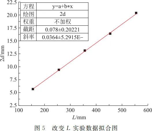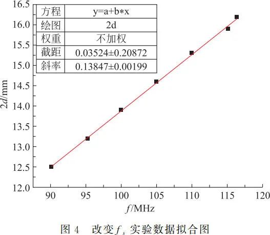 根据式(3)可以得到 2d 与 fs 和 L 均成正比,对实验测量得到的表 1 和表 2 中数据进行拟合,分别作图 4 和图 5,然后得到斜率并代入式(3),计算得到改变频率条件下超声波声速为 v = 4158m/s,改变超声器件与白屏距离条件下超声波波速 v = 4047m/s。
