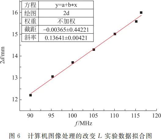 同理,根据表 3 数据拟合作图 6,得到计算机图像识别情况下的数据斜率值,以此求出改变频率条件下超声波声速为 v = 4221m/s。