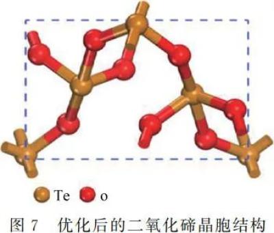 经过 Castep 结构优化后,二氧化碲的晶胞结构如图 7 所示,属于正方晶系,点群对称为 422,元胞中包含 8 个氧和 4 个碲共 12 个原子。计算的晶格常数 a、b、c 和 α、β、γ 并列在表 4 中,与文献[5,6]中的实验值和计算值均符合得很好。在此基础上对二氧化碲进行弹性常数的计算得到材料的体弹模量为 89.57GPa,代入声速的计算公式