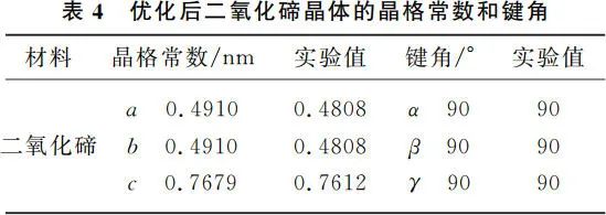 其中,G 为材料的体弹模量,ρ 为材料密度[7],根据表 4 的晶格常数可以得到二氧化碲的体积,再根据晶胞中元素摩尔质量可得二氧化碲材料密度 ρ = 5.63g/cm3。代入公式(4)可得通过模拟计算的二氧化碲的超声波声速 v = 3987m/s。