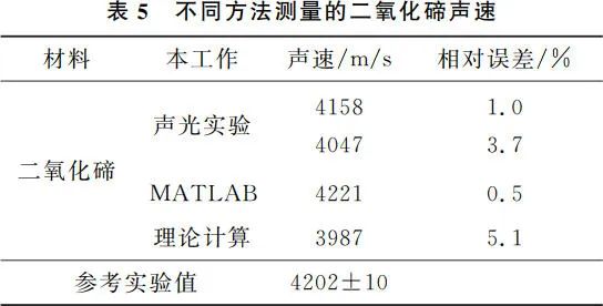 本工作中用声光实验、MATLAB 数据处理和纯理论计算三种方法得到的二氧化碲晶体声速数值列于表 5 中。和文献[8]中已有的二氧化碲沿(001)方向声速实验数据 4202±10m/s 进行对比,发现基于量子力学原理的 Castep 理论计算结果和参考实验值相差较大,两者差值为 215m/s,相对误差为 5.1%。Castep 软件计算结果是基于温度为 0K 基态条件,而实验结果一般都在室温情况下得到,我们进行实验时,当天实验室温度为 283K 左右。根据固体物理知识,固体中的声速随着温度发生变化,这是导致两者误差较大的主要原因。另一方面,本工作中通过肉眼读取坐标纸方法得到的两种声速分别为 4158m/s 和 4047m/s,参考值误差为 1.0%和 3.7%。而通过 MATLAB 编程识别衍射图方法得到的声速为 4221m/s,和文献中参考值最接近,误差仅为 0.5%。可见相对于肉眼测距方法,通过 MATLAB 程序识别图像得到的数据更为精确。图 3 坐标纸方法中最小刻度为 1mm,误差是在 0.1mm 级,2d 的数值也在 0.1mm 级别,所以通过肉眼读取 2d 时会出现较大误差。在 MATLAB 图像识别的数据处理中最小刻度值远远小于 1mm 级别,导致误差远远小于 0.1mm。因此采用计算机 MATLAB 图像识别方法可以有效提高声速测量值的精确度。在物理实验中引入 MATLAB 图像识别和计算机数据处理可以提高实验精度,锻炼学生的编程能力。同时通过第一性原理理论计算,可以进一步深入了解晶体几何结构和物理性质,阐明实验背后蕴含的物理原理,研究和探索线下实验、数值仿真和理论计算三位一体式新型物理实验课题教学模式,培养学生创新能力[9]。