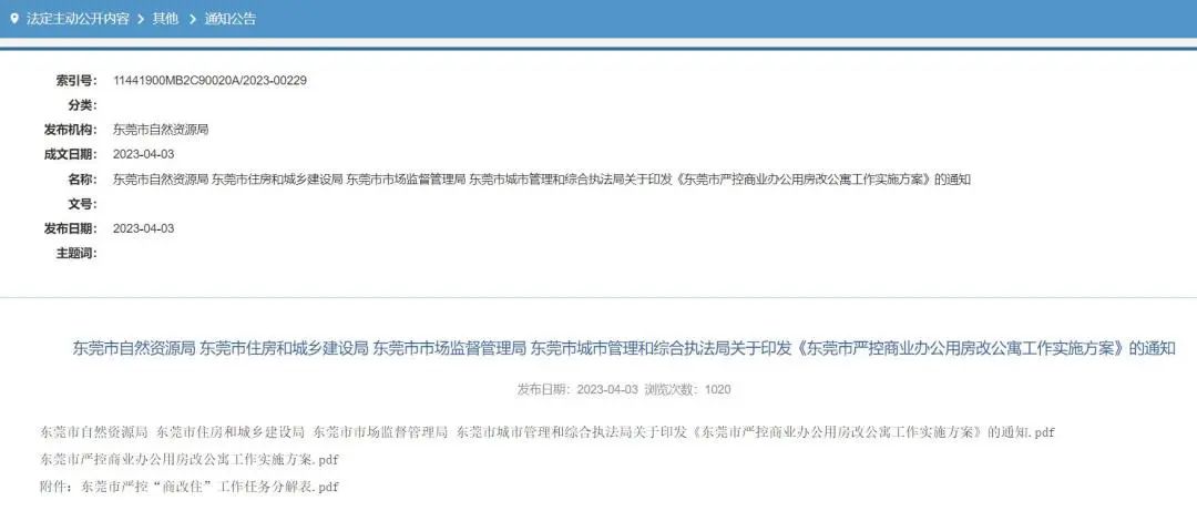 4月3日,东莞市自然资源局、东莞市住房和城乡建设局、东莞市市场监督管理局、东莞市城市管理和综合执法局联合印发《东莞市严控商业办公用房改公寓工作实施方案》(下称《方案》)。