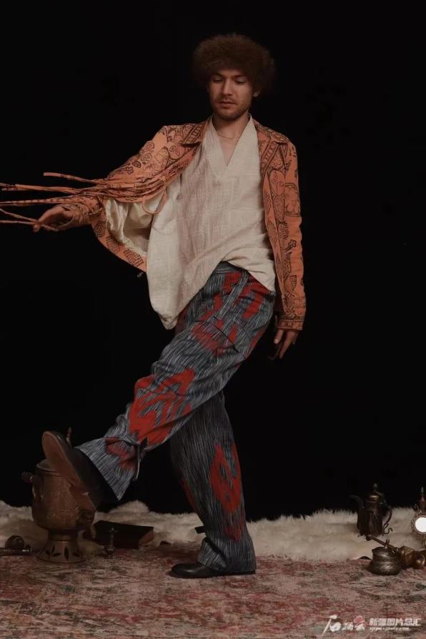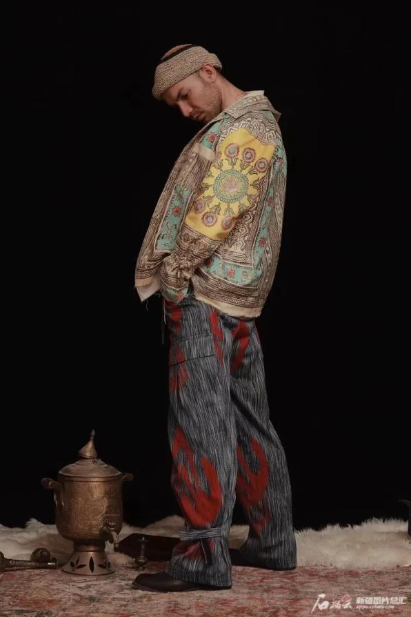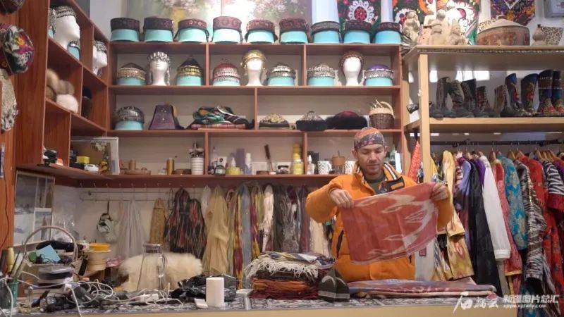 短短几年,小店墙面和走廊里挂满了他设计的服饰。艾德莱斯绸缎配上现代化的铆钉,塔吉克族特色头饰下缀着开满牡丹花的丝绸,传统粗布印花后成为独一无二的坎肩……在他的店里,没有一件服饰是相同的,每一件都通过不同色彩的碰撞、传统现代理念的融合,拥有了独特的造型。