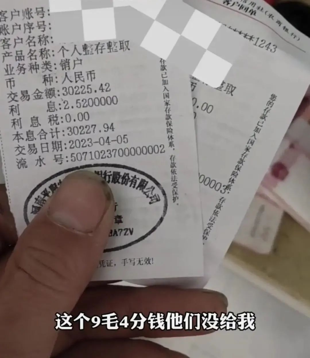 近日,有网友发视频称自己在一家银行取钱,本息合计30227.94元,结果只收到了30227元。
