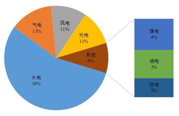 2021年,巴西总发电量为6544亿千瓦时。其中,水电是巴西第一大电力来源,水电发电量为3628亿千瓦时,在全国电力结构中占比55.4%。巴西燃气发电量为869亿千瓦时、风电发电量为723亿千瓦时、光伏发电量为717亿千瓦时、燃煤发电量为241亿千瓦时、燃油发电量为219亿千瓦时、核电发电量为147亿千瓦时。人均全社会用电量约为2580千瓦时/人。由于国土面积大部分位于热带雨林地区,巴西有丰富的水电资源,水电也成为了巴西最大的电力来源。巴西水电在国家电力结构中的占比仅次于加拿大,位居世界第二位。水电占比大,也使得巴西在干旱的年份也容易出现用电短缺情况,为此巴西积极发展核电等电力形式,减少对水电的过分依赖。