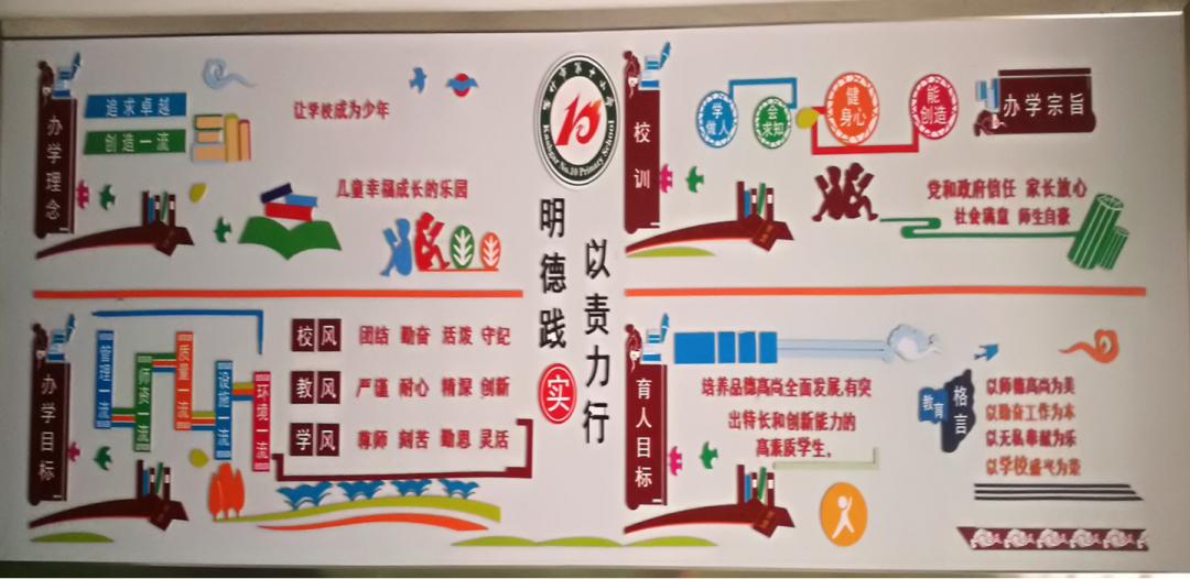 楼道内励志名言警句、传统文化推荐都使师生在行走中受到“正能量”的感染;学生的书画作品结合时事,给孩子提供一个展示自己感悟思想的平台,向教师和学生传达正能量,校史墙上的一行行文字记载的是建校69年的风雨与辉煌,今昔对比的照片让我们感受到发展进步所昭示的希望,只有付出热忱与心血,才有如今的桃李芬芳。