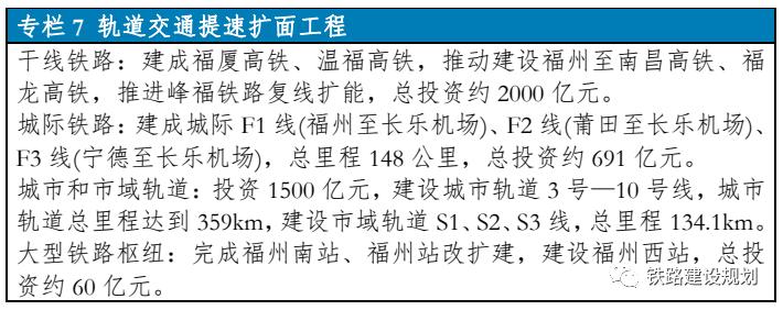 轨道交通提速扩面工程:投资约4000亿元,加快建设干线铁路、城际铁路、市域铁路、城市轨道交通多层次深度融合的轨道交通一张网,完善一体化换乘的大型铁路枢纽,推动铁路车站、轨道交通站同台换乘、立体换乘,发挥不同网络的乘数效应,打造“轨道上的福州”。