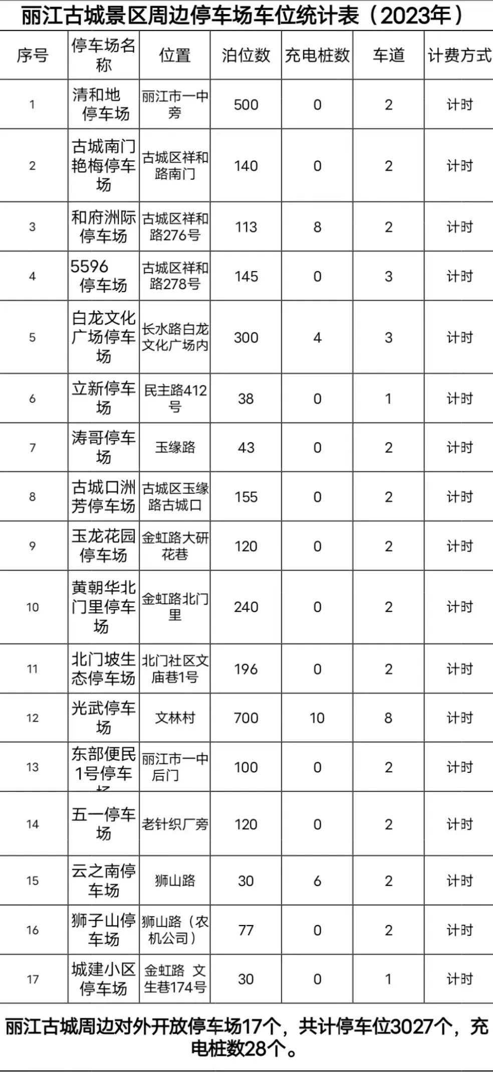 丽江古城景区周边共有17个对外开放的停车场,共计停车位3027个。