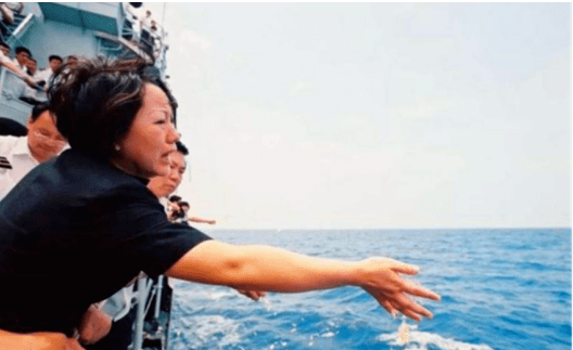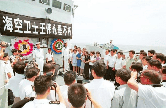 在王伟被确认牺牲后的第三天,海军为他举行了海祭。他的妻子阮国琴面对着大海泣不成声。