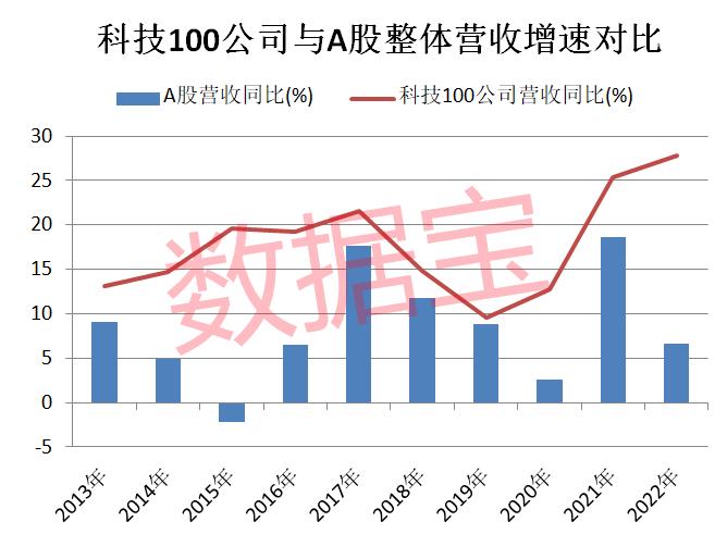 科技龙头公司的整体业绩显著高于A股水平。数据宝统计显示,在过去十年中,这100家科技龙头公司营收增速持续高于A股,净利润增速有9个年度高于A股水平。2022年,科技龙头公司总营收达到3.2万亿,同比增长27.79%;净利润总和达到2921.76亿元,同比增长28.65%。营收和净利润均为历史新高。