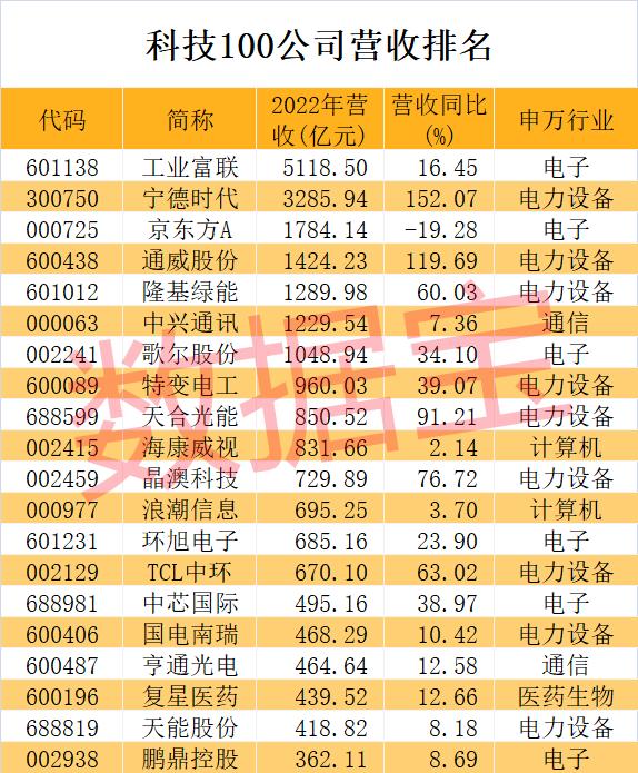 数据宝统计,超半数科技龙头公司营收逾百亿,其中工业富联、宁德时代、京东方A、通威股份、隆基绿能、中兴通讯、歌尔股份等7家公司营收超千亿。
