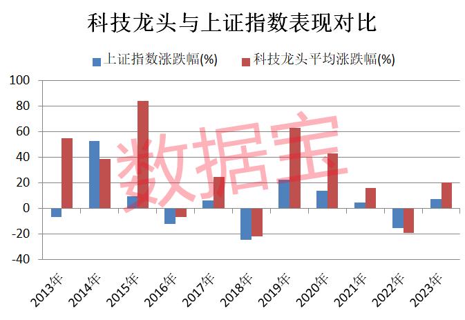 与大盘对比来看,科技龙头整体回报率可观。数据宝统计,按可比计算,科技龙头公司2013年至2022年期间有8个年度平均涨幅跑赢上证指数。
