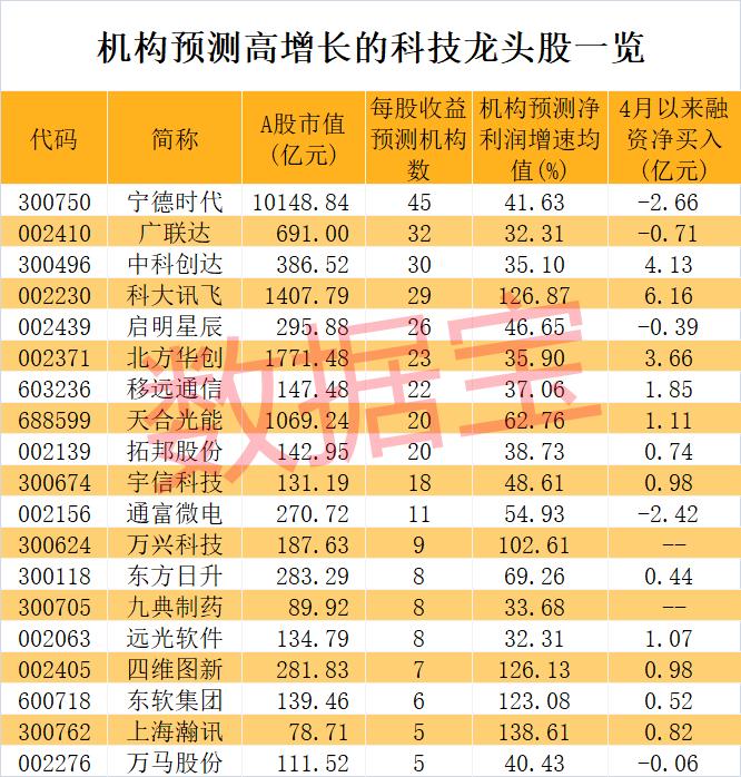 从未来增长潜力来看,按照5家以上机构一致预测,19只科技龙头股获机构预测今后两年净利润增速均超30%。4只千亿市值的巨头公司入围其中,包括宁德时代、北方华创、科大讯飞、天合光能。