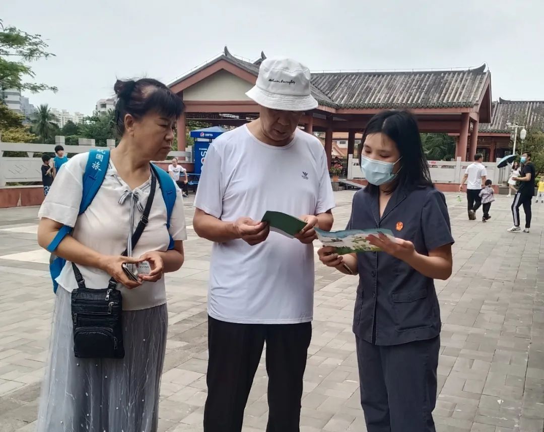 “您好,我是美兰区人民法院旅游巡回法庭的法官,您在旅游期间遇到法律难题可以咨询我们,我们会提供免费的法律咨询服务。”美兰区法院执行局法官刘少杰亲切的话语不断传入市民游客的耳中。在游人如织的海口市白沙门公园,秉持着“人在旅途,法在身边”的服务宗旨,美兰区法院旅游巡回法庭在白沙门公园游客中心设立点位,为广大游客市民们讲解旅游巡回法庭职能、人民法院诉讼流程等相关事项及知识,耐心解答游客提出的法律问题。