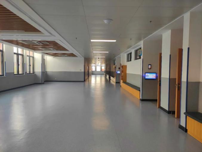 此外,教室门口的休息区还设有座椅和书架,孩子课间可以在这里休息,教室门前的走廊区域足够开阔,万一发生火情还有防烟隔档降落。