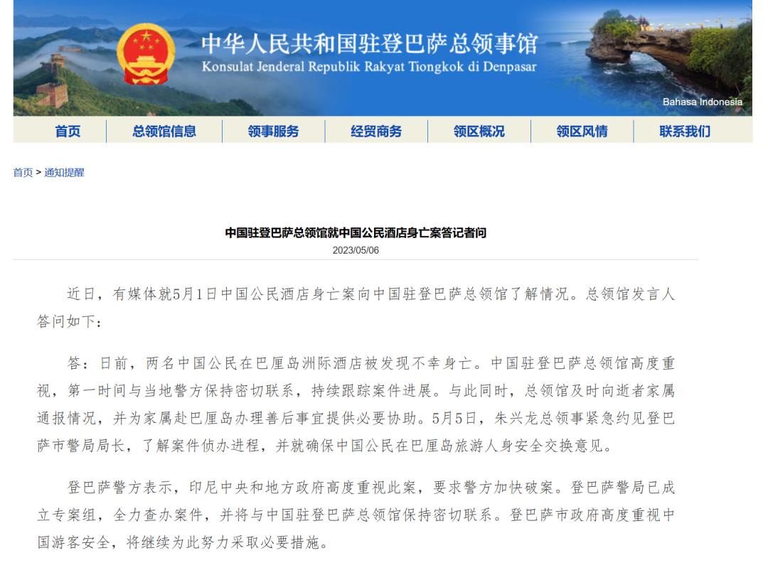 答:日前,两名中国公民在巴厘岛洲际酒店被发现不幸身亡。中国驻登巴萨总领馆高度重视,第一时间与当地警方保持密切联系,持续跟踪案件进展。与此同时,总领馆及时向逝者家属通报情况,并为家属赴巴厘岛办理善后事宜提供必要协助。5月5日,朱兴龙总领事紧急约见登巴萨市警局局长,了解案件侦办进程,并就确保中国公民在巴厘岛旅游人身安全交换意见。