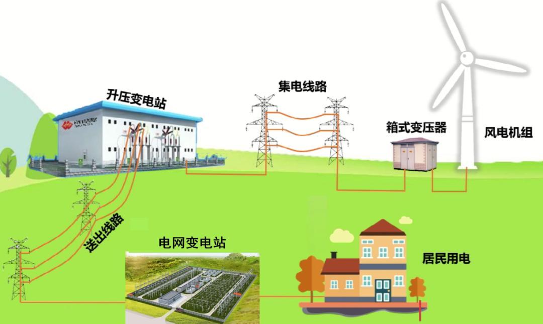 风电场由风力发电机组、箱式变压器、输变电线路、升压站等部分构成。最终通过送出电路,将产生的电路输送到电网。