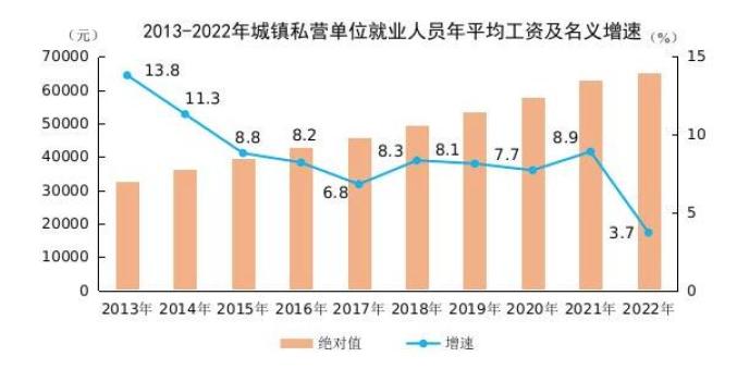 统计数据显示,2022年,全国城镇非私营单位就业人员年平均工资为114029元,比上年增长6.7%,增速比2021年回落3个百分点,扣除价格因素实际增长4.6%;城镇私营单位就业人员年平均工资为65237元,比上年增长3.7%,增速比2021年回落5.2个百分点,扣除价格因素实际增长1.7%。