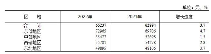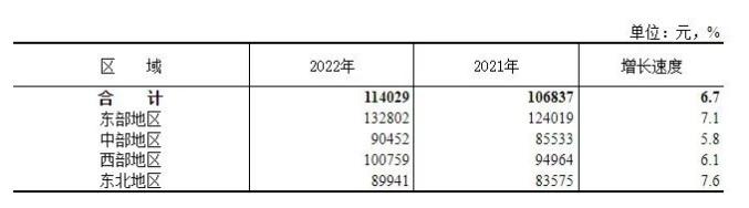 2022年城镇非私营单位分区域就业人员年平均工资。 图片来源国家统计局网站