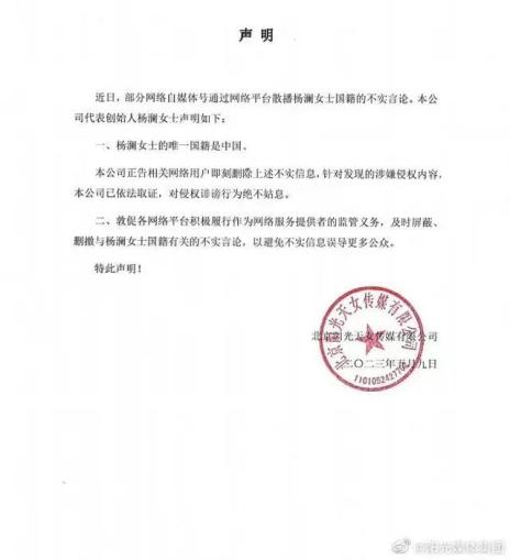 近日,部分网络自媒体号通过网络平台散播杨澜女士国籍的不实言论。本公司代表创始人杨澜女士声明如下: