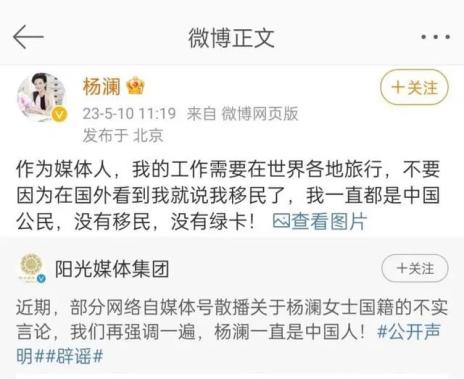 5月10日,阳光媒体集团官方微博发布声明称:近期,部分网络自媒体号散播关于杨澜女士国籍的不实言论,我们再强调一遍,杨澜一直是中国人!