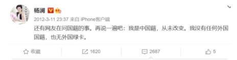 对于这种说法,杨澜早在2012年在微博就发声辟谣:“还有网友在问国籍的事。再说一遍吧:“我是中国籍,从未改变。我没有任何外国国籍,也无外国绿卡。”