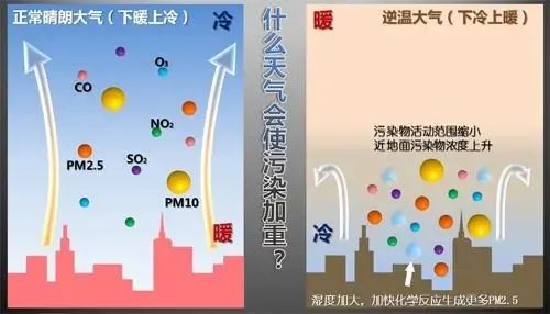 在近地的低层大气,有时出现气温分布与标准大气情况下的气温分布相反,即气温随高度的增加而增加的温度逆增情况,称为逆温。逆温层的出现,使近地低层大气上部热、下部冷,大气稳定,不能发生对流作用,使大气污染物不能在垂直方向扩散稀释,因而容易造成大气污染。