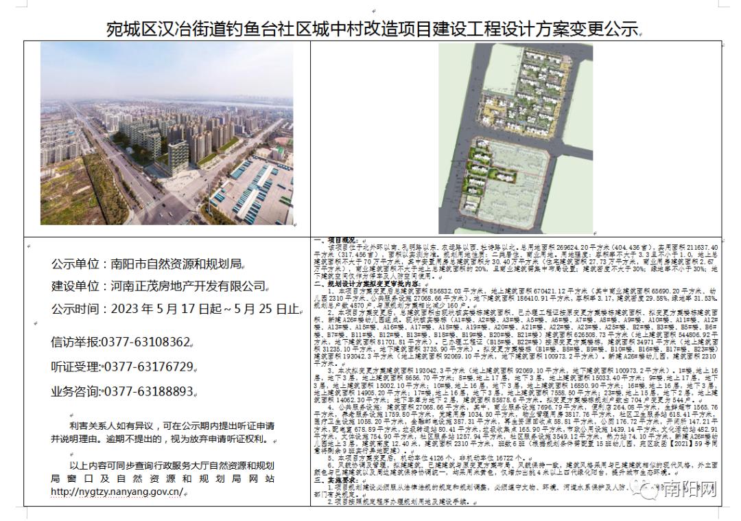 同日,另外一个公示的项目是“宛城区汉冶街道钓鱼台社区城中村改造项目建设工程设计方案变更公示”。