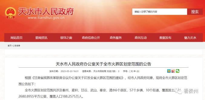 原标题:《天水市人民政府办公室关于全市火葬区划定范围的公告》