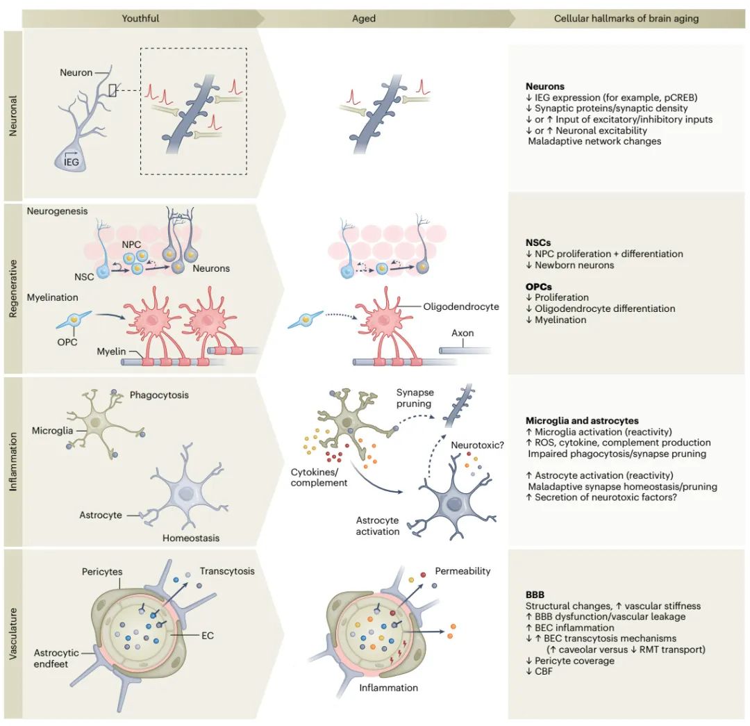 研究人员越来越重视的一个大脑衰老标志是神经炎症,其主要由驻留在大脑中的巨噬细胞——小胶质细胞介导。小胶质细胞的衰老伴随着活性氧的生成增加、促炎因子和补体系统的表达增加、广泛的形态变化和吞噬功能的损伤。在功能上,衰老相关的小胶质细胞吞噬功能障碍与认知能力下降有关。小胶质细胞通过在衰老的大脑中释放促炎因子和补体成分,在星形胶质细胞反应中发挥关键作用。随着机体逐渐衰老,星形胶质细胞变得更具“反应性”,其特点为突触清除、神经毒性和少突胶质细胞毒性相关的基因表达上调。小胶质细胞和星形胶质细胞通过分子信号(如补体)的改变,在一定程度上共同调节衰老过程中的突触修剪。人们越来越重视大脑中小胶质细胞和星形胶质细胞,在发育过程中和成年时的功能异质性。更广泛地说,神经炎症变化也可能受到其它类型细胞的调控,例如屏障相关巨噬细胞和多种驻留在大脑屏障中的免疫细胞,提示这些细胞可能与大脑衰老和认知下降有关。