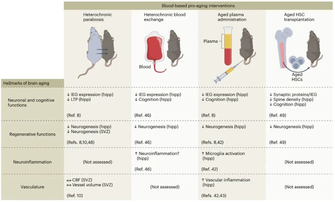 异体共生已证明可以使衰老的肌肉、肝脏、心脏、胰腺、骨骼、脊髓和大脑再年轻化,最终延长寿命和健康寿命。在大脑中,它改善了多种细胞衰老标志,导致突触可塑性和突触密度增加,海马和SVZ神经发生增加,血管密度和CBF增加,前脑细胞衰老标志物减弱。同样,通过异体骨髓移植,用年轻免疫细胞恢复衰老血液的细胞成分增加了老年小鼠的突触密度,减弱了小胶质细胞的激活,增强了海马依赖性认知功能(图3)。