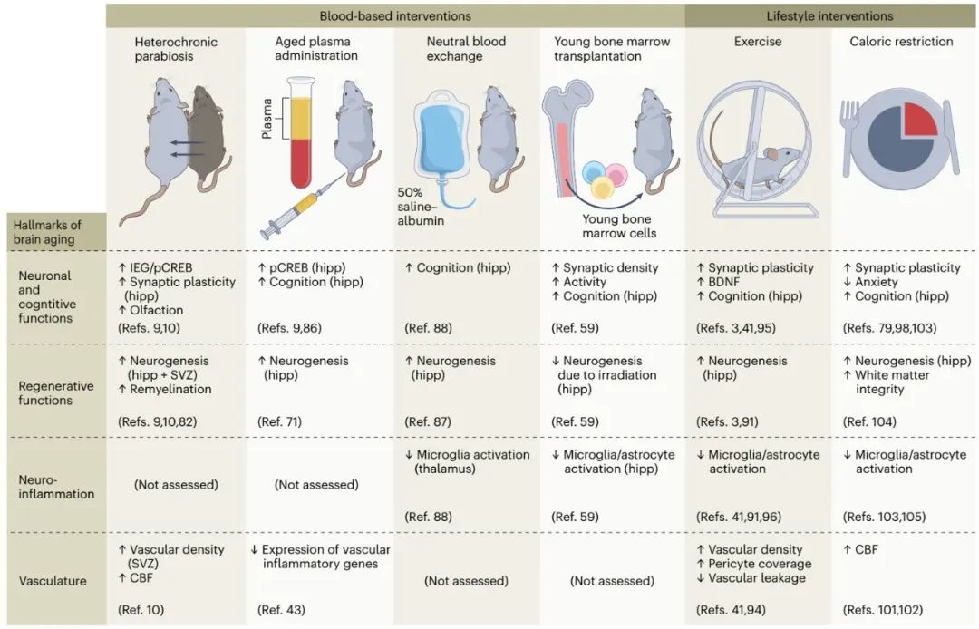 在老年人群和动物模型中,神经退行性疾病相关的风险因素及其合并症(包括肥胖、糖尿病、高血压、心血管疾病和慢性炎症)与认知能力下降有关。例如,肥胖动物模型表现出突触可塑性受损,神经炎症增加,海马神经发生减少等。同样,慢性和急性炎症,如伴随有脑雾的长新冠(COVID-19)和呼吸道新冠感染的动物模型,都显示出神经炎症、再生功能和认知能力变化,反映了先前描述的大脑衰老的特征。此外,血浆CCL11水平在新冠动物模型和新冠患者中升高,CCL11最初被描述为异体衰老中的促衰老因子。因此,针对危险因素和合并症的治疗或生活方式干预可能通过参与促衰老的驱动因素直接或间接地恢复衰老大脑的功能。