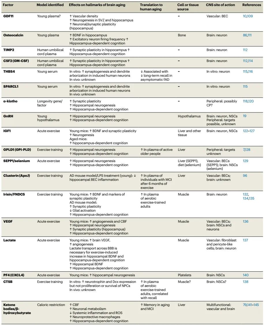 在发现来自年轻或“运动”动物的血浆可以使衰老的大脑恢复活力之后,多个研究团队试图通过评估血液成分的变化来识别“年轻血液”和生活方式干预对衰老大脑影响的促年轻化因子。越来越多的有益因子以及恢复活力的机制被发现,突出了血液对衰老大脑的多方面影响,如下所述(表2)。