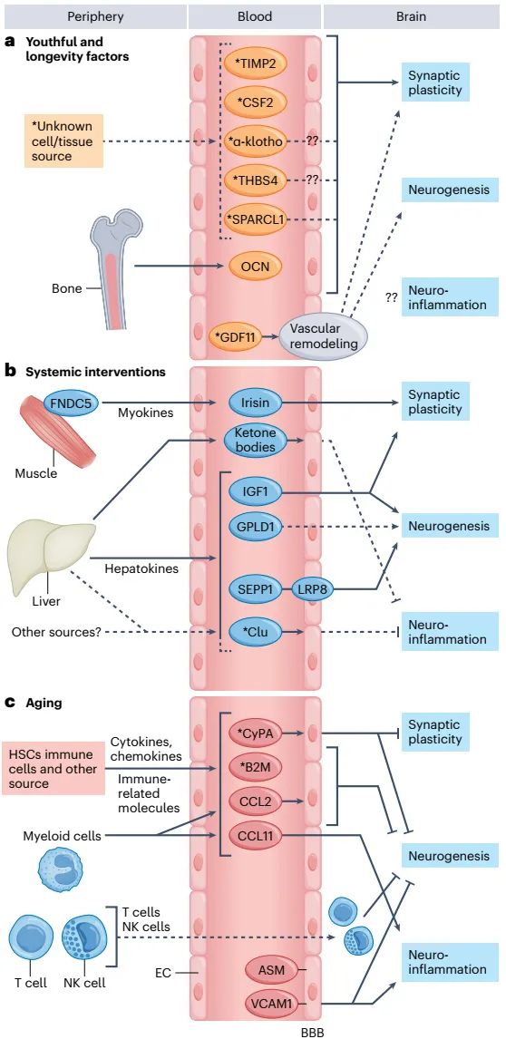 促衰老因子和促年轻化因子在多大程度上是通过收敛或发散机制发挥作用?造血系统和炎症过程是促衰老因子的常见来源。然而,在许多情况下,细胞类型或组织来源仍然模糊不清。尽管早期的工作确定了一系列肌肉衍生的肌因子,但肝脏作为主要的分泌器官正在迅速成为运动诱导因子的额外来源,IGF1、GPLD1、SEPP1和簇集素都是假定的肝源性运动因子(图4)。关于作用机制,许多衰老和恢复活力的因子对大脑产生类似的影响;因此,重要的是要了解每个因子是否通过相同或平行的细胞靶标和分子途径起作用。鉴于老年血液中促衰老因子的主要免疫性质,小胶质细胞似乎是明显的第一靶标。然而,最近的几项研究强调BECs是一个潜在的纽带,通过它,包括VCAM1、ASM、CyPA和CCL2在内的促衰老因子能调节大脑衰老。相反,在GDF11、簇集素、GPLD1和α-klotho等干预措施中确定的促年轻化因子同样可以通过恢复衰老脉管系统和其他外围目标的功能来间接地对衰老的大脑发挥恢复活力的作用。此外,一系列促年轻化因子,包括TIMP2、骨钙素、SPARCL1和THSB4,似乎选择性地增强突触或认知功能;而其他的,如FGF17和SEPP1,已被证明可以调节再生和干细胞功能。总的来说,这些发现表明,大脑功能可以通过几个平行的靶点以及与未来治疗方法相关的直接和间接机制来恢复。