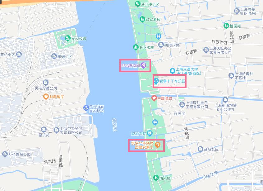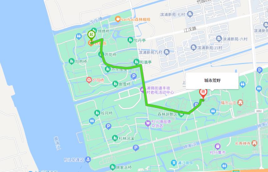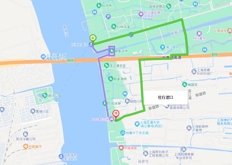 城市荒野到杜行渡口步行路线;也可以取道滨江路-沈杜公路