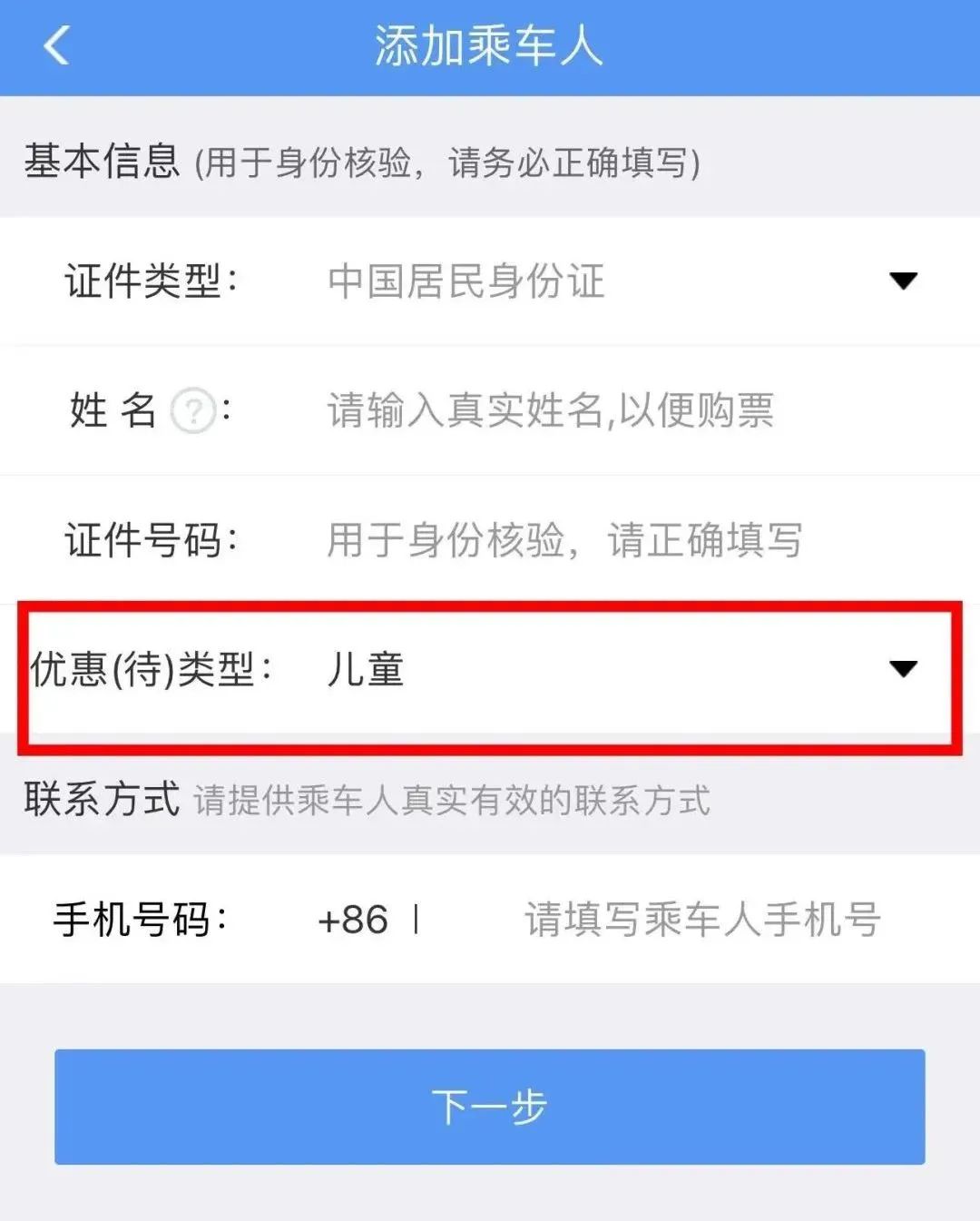 打开铁路12306App,点击“我的”,选择“乘车人”,添加乘车人信息,优惠(待)类型选择“儿童”。选定车次后进入预订页面,点击“选择乘车人”即可。