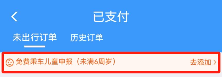 购票完成后,在铁路12306App中的“火车票订单”或“本人车票”中进行免费乘车儿童申报操作。